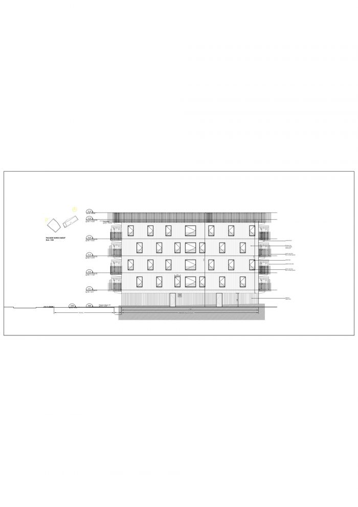 - On one hand, the R building, through the shape of its roof, floors’ movements (R+4 on the Charles de Gaulle Avenue, R+5 in the center, and R+3 on Pierre Loti street) and volumes’ gradual transition, assures a new link toward Aytré city center.