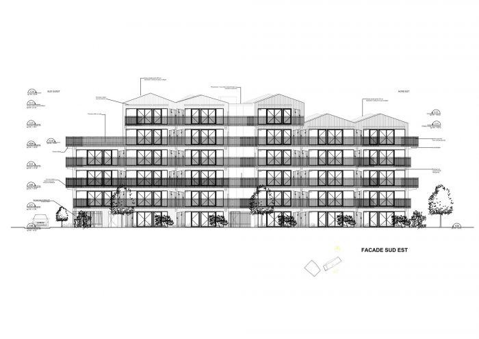 The two constructions offer to the passerby sequenced facades: horizontally with long terraces and vertically with entrances and vertical flows inside the buildings, designed as «rifts». The project highlights ideas of appropriation and habitability, with a wish of giving to each dwelling a nearly private access. The treatment of the side spaces in connection to the Pierre Loti Street and following on from the buildings fits in with the latter outline.