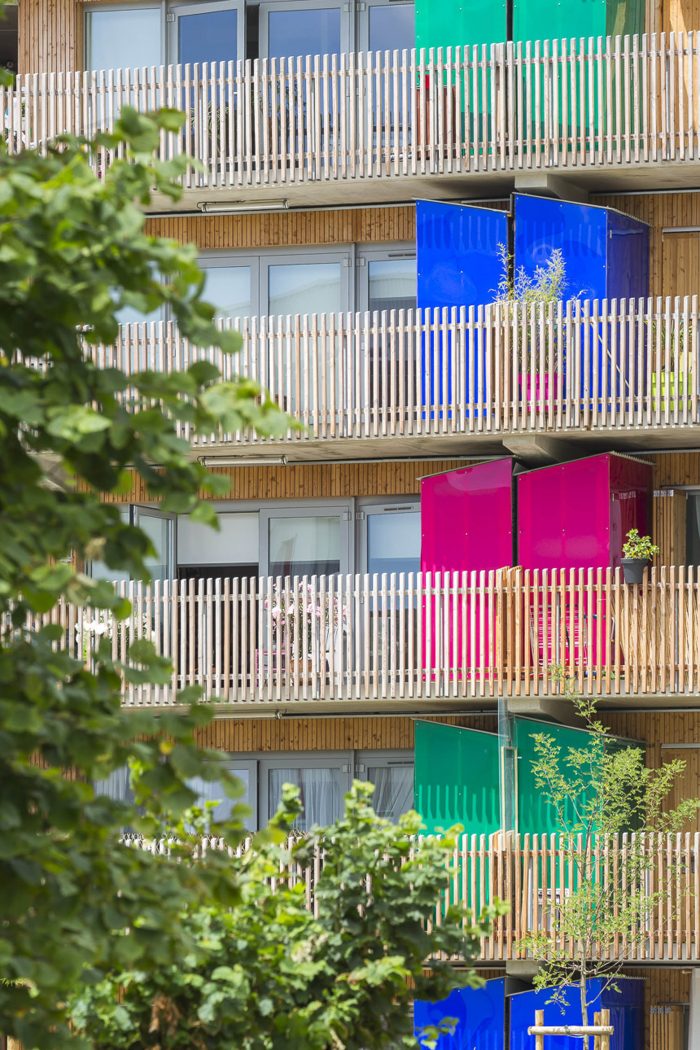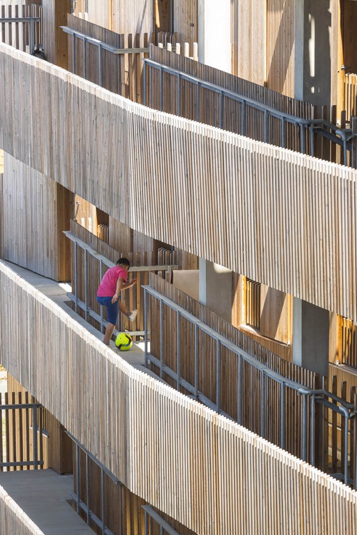 室外走廊允许空中漫步,提供大量的景观并支持邻里关系。此外,它们使住宅具有双视角,受益于双倍或三倍的方向,并保护隐私。它们导致每层只有6个住宅。