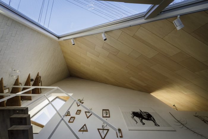 The steep sloping roof and the diagonal exhibition wall are crossed to create a three-dimensional figure of "wide / narrow" or "high / low" crossing space. By creating a scale error in daily life and shaking the feeling, this house will be a house of imagination for the painter, and a tasteful home for the family.