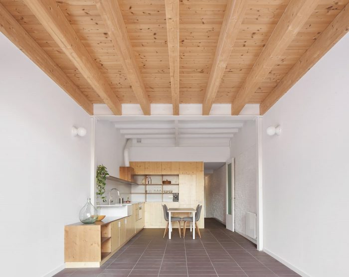 The width of the house conditions the distribution to such an extent that the arrangement of the interior partitions seems to translate directly into the layout of the program. This simplicity is compensated by working with different ceiling heights and qualities. The bedrooms have smooth low ceilings, painted white. The public areas of the house (kitchen-dining room, staircase, study, and multi-purpose room) have high ceilings with exposed beams and vaults, also white. The areas of the extension (living room and second-floor bathroom) have two new wooden beams and plank ceilings that add a counterpoint of warmth to the house. On the second floor, this play of different heights reaches its fullest expression at the point where the spaces of the bathroom and stairway (2.2 m high) lead into the study, where the height of the original sloped roof reaches more than 4 meters. From here, a ladder leads up into the loft. The pavement takes a back seat to the ceilings: the space is tied together by using the same rustic ceramic tile throughout. The sun protection, and roll-up window shades, especially in the rear courtyard, aim to create the same effect as the pavement: they are traditional elements used in a contemporary way.