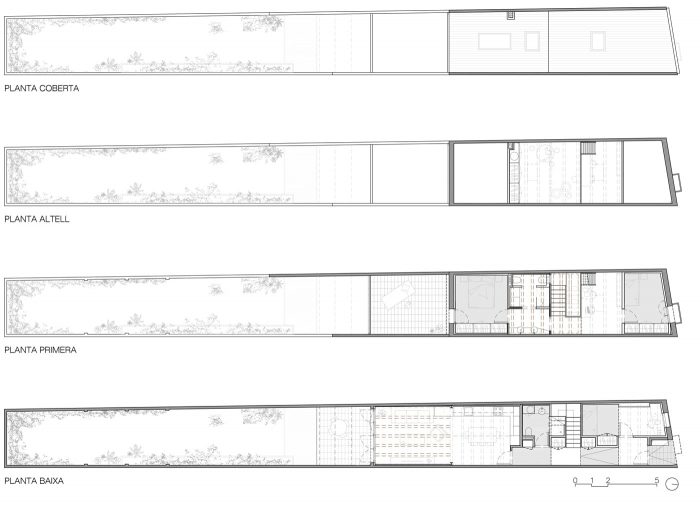 The unique characteristics of this row house come from a very narrow plot (3.8 meters wide) and a very long backyard. The clients, a couple with two children, need the standard program for a family of four. Within the volume of the existing building, we agree to put in three bedrooms of similar sizes and proportions. On the ground floor, looking over the street, the older son’s bedroom. On the second floor, two more bedrooms: one for the couple and the other for the younger son, each located along one of the façades. The center is occupied by two bathrooms: one on the second floor and another on the ground floor, also for guests. The volume of the building is expanded in order to place the kitchen-dining-living room adjacent to the patio garden, at the same level. A new loft space is added under the roof, which provides an extra multi-purpose room that can be used as a study or as a fourth bedroom. The original staircase is maintained. There is no need for a parking area.