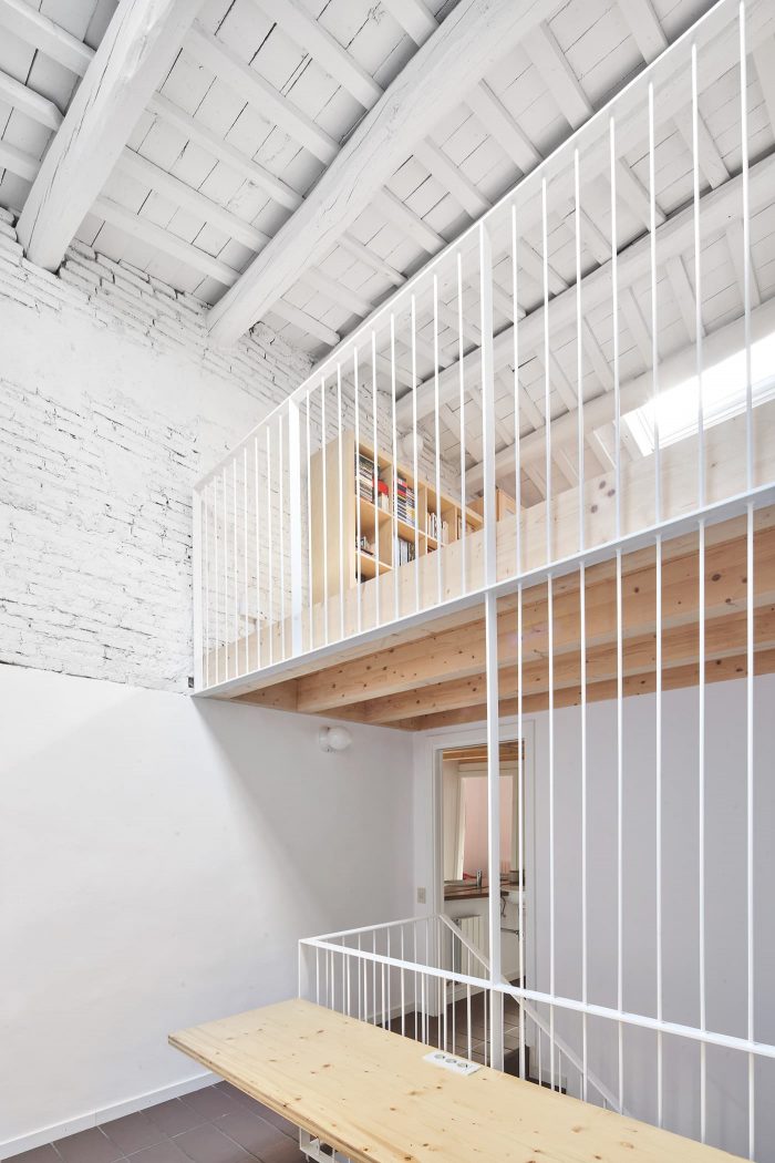 房子的宽度为分配提供了条件,以至于室内隔断的安排似乎直接转化为方案的布局。这种简单性通过使用不同的天花板高度和质量得到了补偿。卧室有光滑的低天花板,涂成白色。房子的公共区域(厨房-餐厅、楼梯、书房和多功能厅)有高高的天花板,有裸露的横梁和拱顶,也是白色。扩建的区域(客厅和二楼的浴室)有两根新的木梁和木板天花板,为房子增加了一种对立的温暖感。在二楼,这种不同高度的游戏在浴室和楼梯的空间(2.2米高)通向书房的地方达到了最充分的表现,那里原来的斜屋顶的高度达到了4米多。从这里,一个梯子通向阁楼。铺面的位置比天花板的位置靠后:整个空间通过使用相同的质朴的陶瓷瓦片而被联系在一起。遮阳和卷帘窗,特别是在后院,旨在创造与铺面相同的效果:它们是以现代方式使用的传统元素。