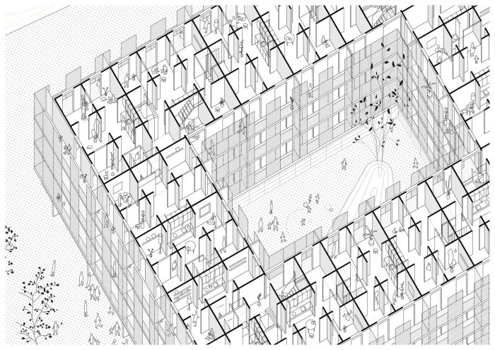 该建筑围绕着一个院子组织,连接着一系列的中间空间。在底层,一个向城市开放的门廊预示着建筑的门口,并过滤了公共空间和公共庭院之间的关系,该庭院作为社区的一个小广场。四个交流井位于庭院的四个角落,而不是从外立面直接和独立地进入建筑的每个走廊,这样所有的居民就会聚集在一起,在庭院广场上见面。在典型的楼层,通过私人露台进入住宅,这些露台构成了俯瞰院子的环形户外空间。该建筑的总体平面图是通过沟通房间的布局来组织的。每层楼有114个空间,全楼有543个,尺寸相似,取消了私人和公共通道,以充分利用表面积。服务器空间被安排在中央环,而其余的房间,用途和大小不一,约13平方米,沿立面运行,呈现出不同的占用形式。外环的另一个露台完成了空间序列,这一排空间通过大的开口相互连接,对空气、视线和运动具有渗透性。