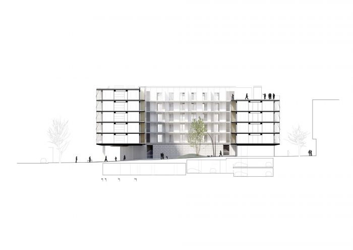 The 85 dwellings are distributed in four groupings, with a total of 18 units per floor. Four or five homes are laid out around each nucleus so that all typologies have cross ventilation and dual orientation.