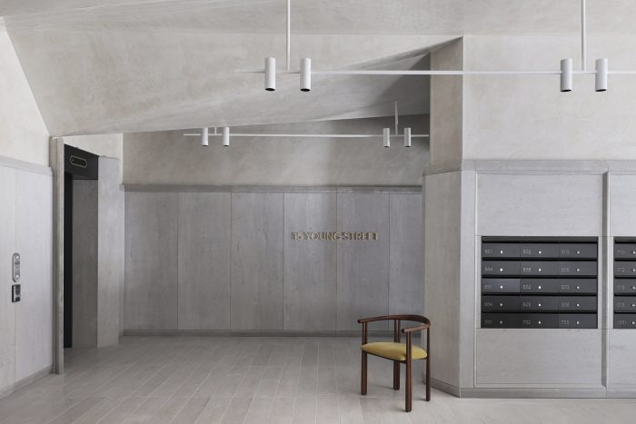 Featuring rich, velvety materials, 9-15 Young Street is made of luxurious brick, with deep reflective window reveals sitting above the glazed commercial office façade below. This richness and contrast respond to the historic masonry of nearby Bridge Street. Steel awnings with polished brass soffits are draped from the facade – creating an active pedestrian-scaled yet intimate street experience.