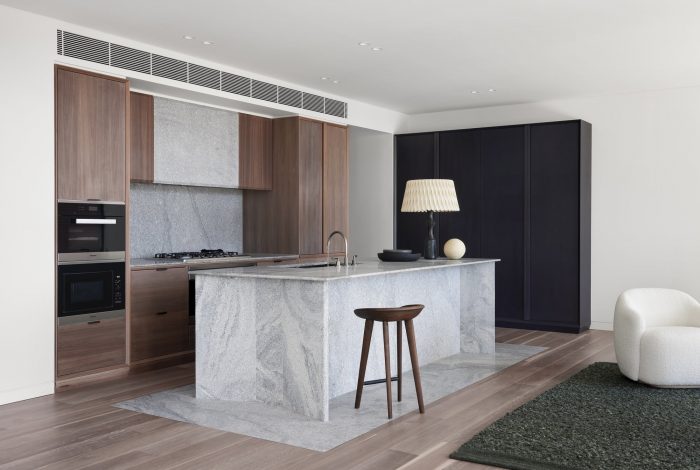 八层公寓坐落在城市天际线的高处,拥有景观屋顶和悉尼港的私人景观。住宅享有厚厚的围墙,可以容纳窗边的座椅和悉尼地标的精心安排的框架景观。双层的空隙使选定的起居室具有豪华感,这在城市内的多住宅开发项目中是罕见的。