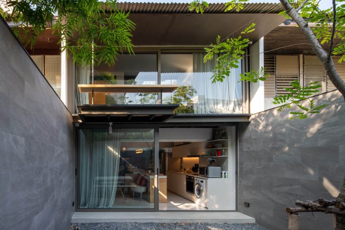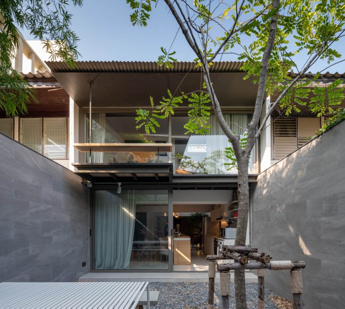 Once the owners, started looking for their own house close to their workplace, they ended up acquiring Baan 96/1, the 30 years old row house standing next to their studio. First, they decided to maintain the existing exterior appearance in respect to its surrounding neighbor. However, with the steep slope gable roof extending from the master bedroom wall in the second floor to the parking garage on the first floor blocking the northern light, and the location of the toilet in the mid-section core of the house preventing a cross ventilation, the architects decided to empty the interior walls and the false ceiling of the house and rearranged the spatial quality in order to meet their living lifestyle.