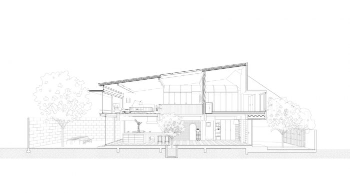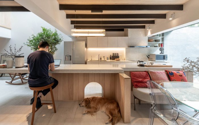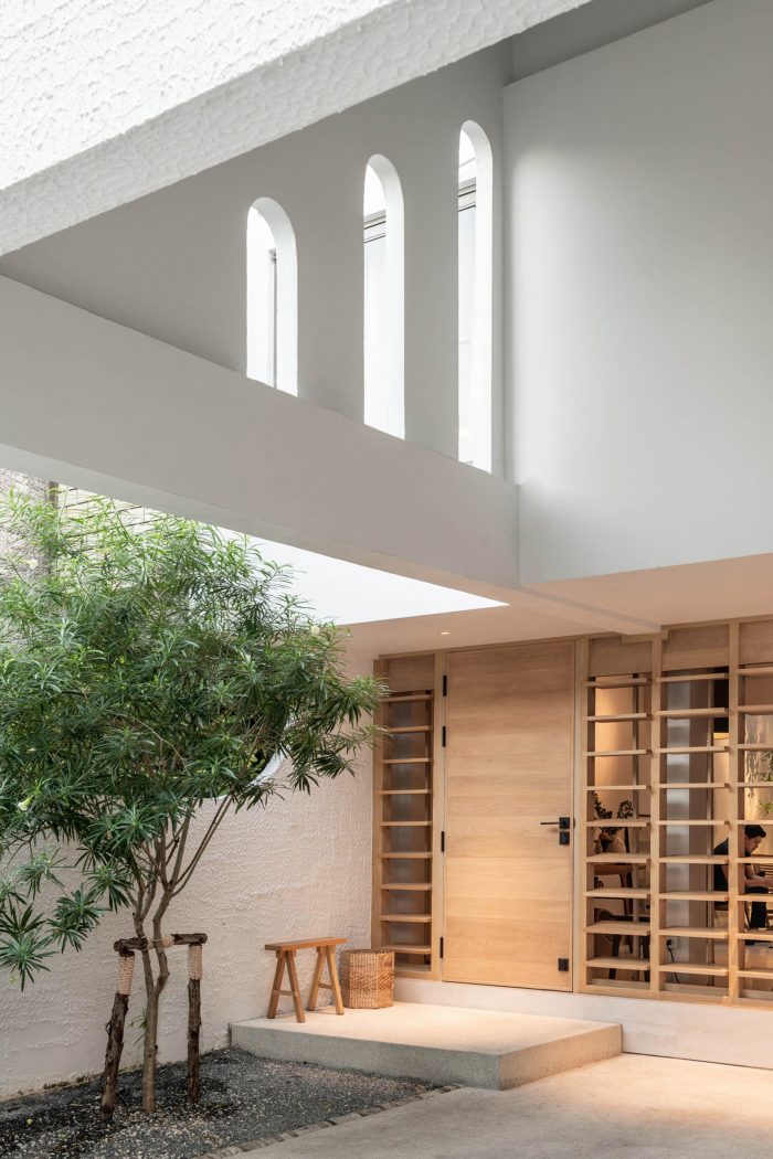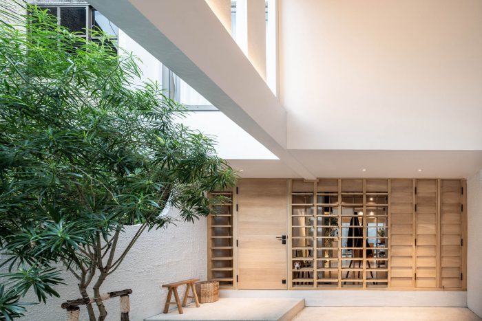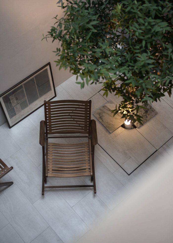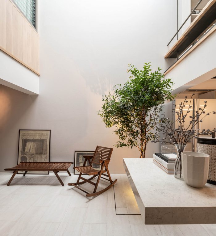 On the ground level, with the intention to create a single space interconnecting public and space altogether, the architects began the design by intuitively inserting a small green double height courtyard with a skylight. Next, they decided to place the five-meters long white counter island as a main horizontal element to balance with the vertical presence of the courtyard. With meticulous concern in proportionally juxtaposing elements around this courtyard and the counter, this empty void seems to contain an unspoken meaning encouraging dwellers to make conversation between separated spaces.