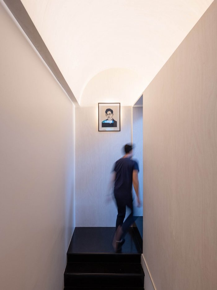 在底层,为了创造一个单一的空间,将公共和空间完全连接起来,建筑师在设计之初就直观地插入了一个带有天窗的绿色双高小院子。 接下来,他们决定将五米长的白色柜台岛作为主要的水平元素,与庭院的垂直存在相平衡。 通过对庭院和柜台周围的元素比例的细致关注,这个空旷的空间似乎包含了一种无言的意义,鼓励居住者在分离的空间之间进行对话。