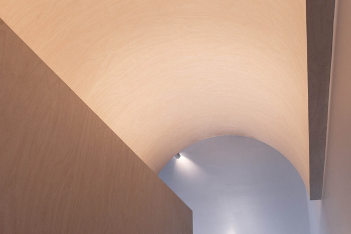 After trying out with using a straight wall and a diagonal wall resembling a gable roof, they came to a conclusion of treating the bathroom as a barrel vault similar to an arch decoration around the exterior of the house. By making the bathroom like an extrude barrel vault, the master bedroom obtains more opening space. The intersecting effect between the barrel vault and the gable ceiling provides a mysterious depth to the room.
