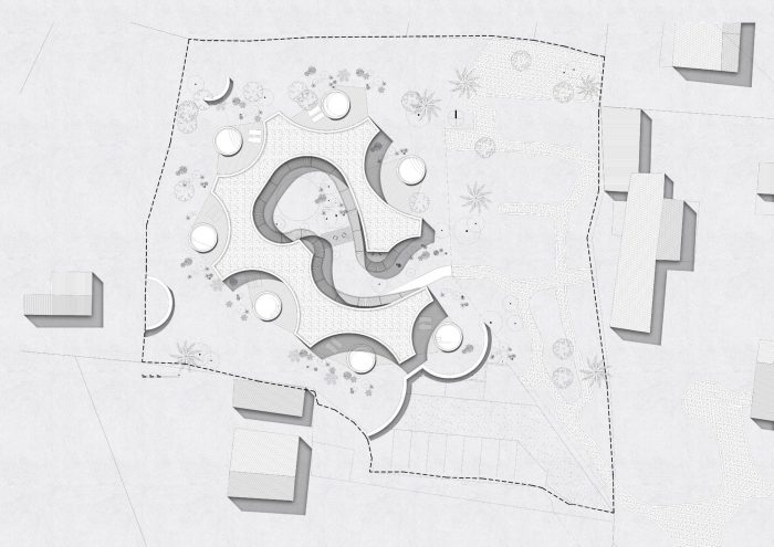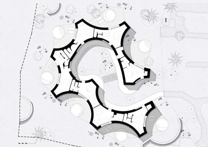 该项目是围绕着一个中央天井组织的,允许每个房间的沙漠,同时尊重隐私。反之,形状的周边起伏,以便为每个房间提供高质量的私人户外空间。