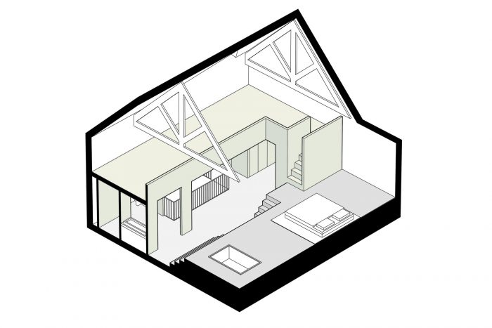 By introducing a new oak staircase with slender steel railings, the living room on the ground floor is connected to the basement on the one hand and the sleeping floor for the children and the multifunctional attic floor on the other. By introducing a robust oak element in this attic, the large space with authentic trusses is divided into a sleeping area with Jacuzzi, a bathroom, a walk-in closet and a mezzanine with workplaces.