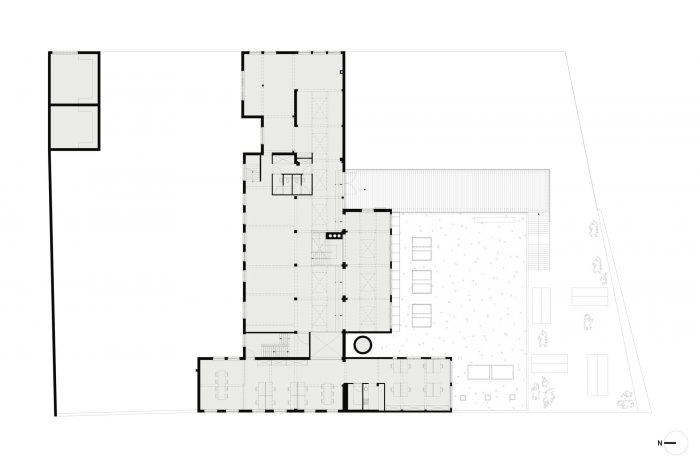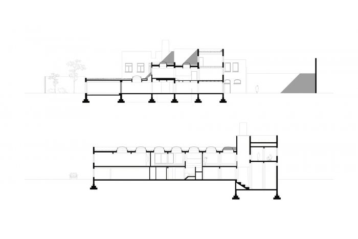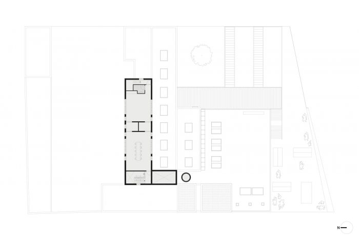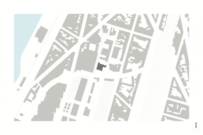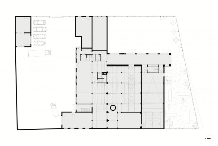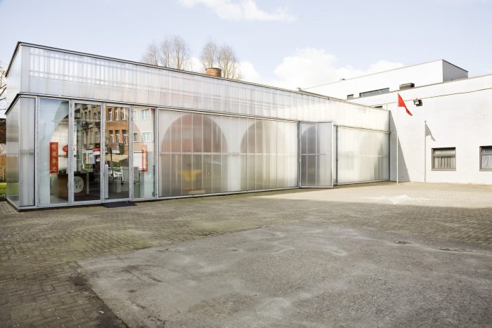 The building enters into dialogue with this dynamic by restoring the existing gallery as an entrance and provides the impulse for an accessible organisation structure inside the building. In a second phase, a newly constructed building with public kitchen and dance studio will reinforce this interactive zone on Gaucheretplein. The other open space on the plot is put to optimum use as connecting space between the internal operation of the building and the external public spaces such as Gaucheretplein, Jollystraat and the bedding of the Senne. A subtly designed fence helps gives definition to these relationships.