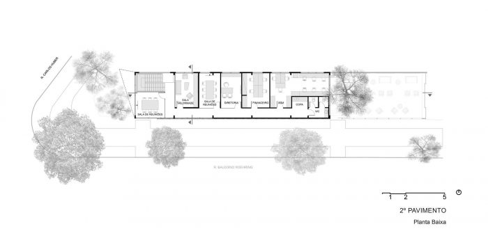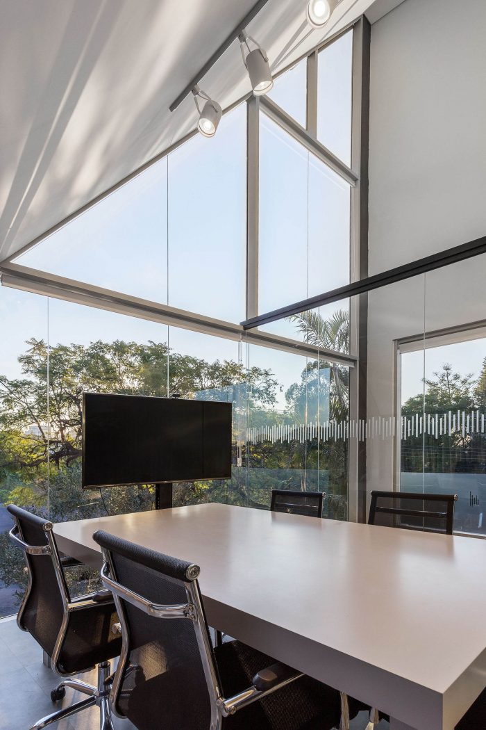 The neighborhood where the building stands is predominantly residential, with houses built many years ago, without a distinctive design character, so the second challenge was to create a building with a change provoking design but also fully integrated to it’s surroundings. Lastly, there was the need to combine all of these design needs to the multiple functionality of having administrative headquarters and the business and sales center for the projects that will be launched there, using a very narrow site to build it.