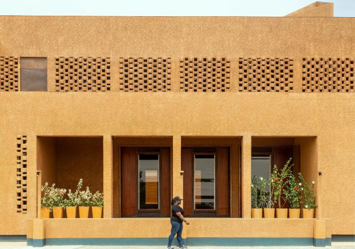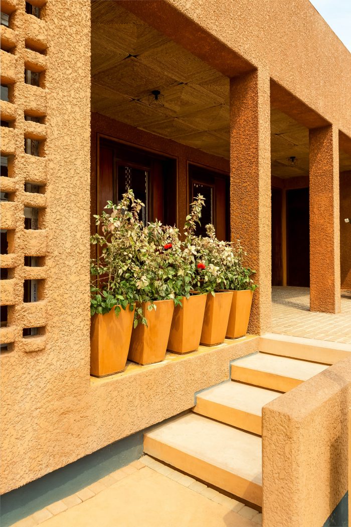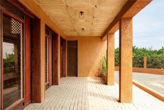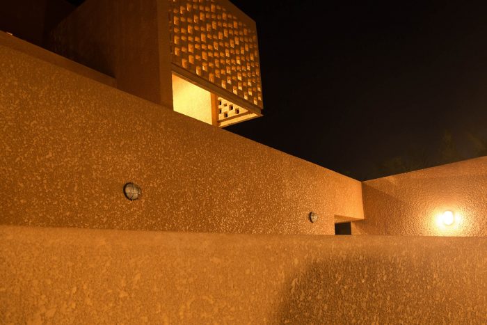 The aesthetic of the mosque is based on the notion that the materiality had to be sustainable and locally sourced so that the frequent intervention through maintenance of the building was reduced considerably. A textured skin consisting of laterite, sand and cement mixture was used to coat the external face of the envelope of the masjid (a place of prostration). The insulation properties of the laterite wall, help keep the inside of the mosque cool.