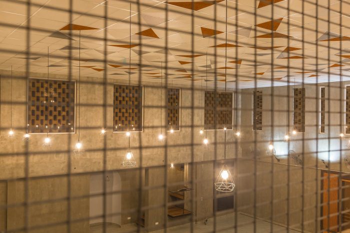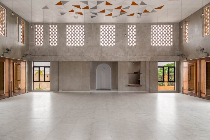 The large apertures in the external walls are framed with Iroko wood. The sliding doors have louvre windows incorporated into them to aid ventilation when the panels are not open. The ceiling of the main hall and the mezzanine screens consist of forms and visual illustration of geometric compositions that can be fundamental elements for both the inside and outside religious buildings.