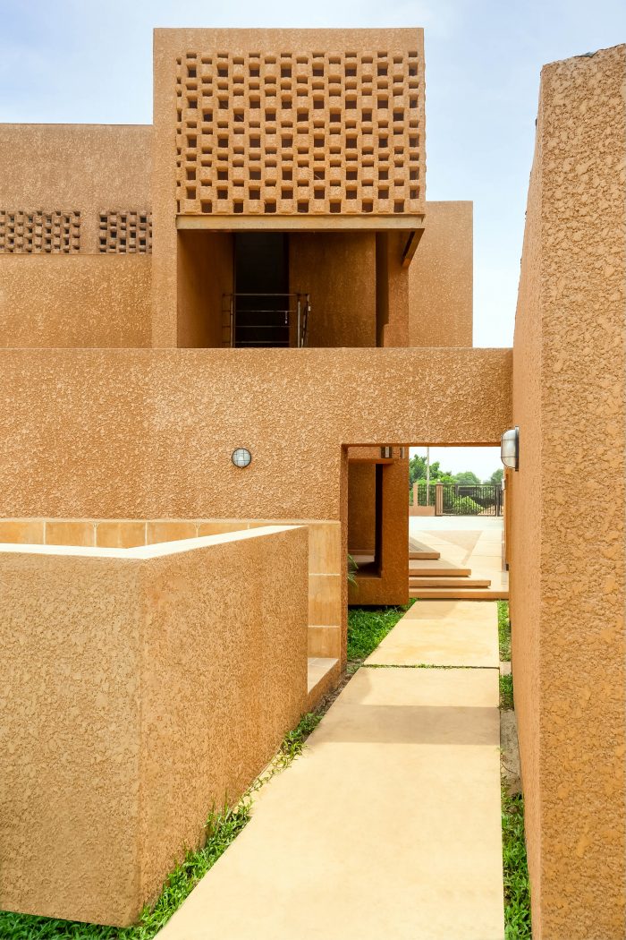 High-level louvre windows help manage the stack-effect ventilation of the building. The window openings are shaded with perforated sunscreens made from recycled paving stones salvaged from another project. Attached to the main building is the Imam’s office and the CB office to the north and south of the prayer hall. Outside on top of the building stands the Minaret (tower), which is symbolic as a beacon to Abijo.