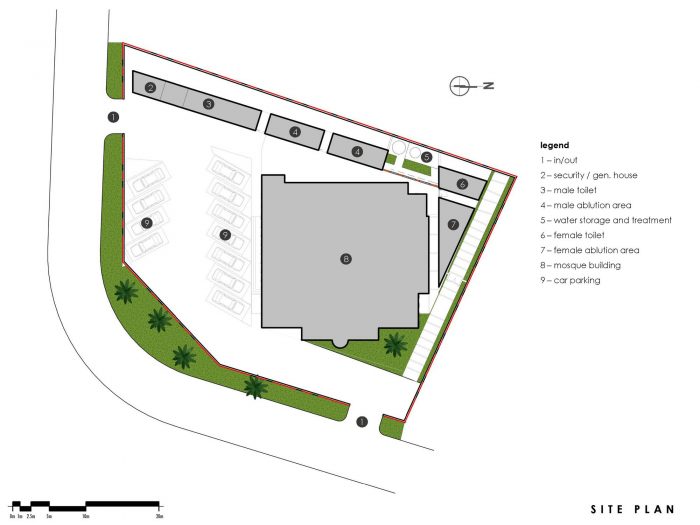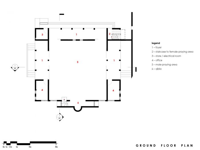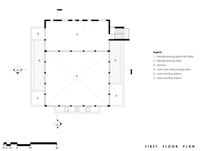 There is Minbar, which is to the right of the Mihrab, used by the Imam as a pulpit. The building is a double volume box accessed from three sides, with a mezzanine with a separate entrance, included to accommodate the female worshippers. To further increase the capacity of the mosque, the west, north and south walls have openings with sliding panels which open-up completely to extend the prayer hall to the galleries for Friday congregational prayer service.
