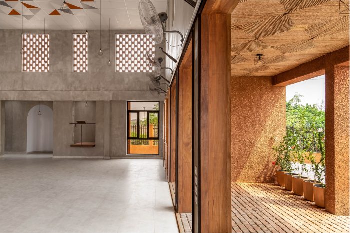 The objective was to avoid the usage of air-conditioning as a means of cooling the building during use. Earthy colours as a theme was also a priority, so for the doors to maintain the same hue as the external walls, mild steel door panels were acid etched to give an earth-colour rusty finish. This same ‘burnt’ finish was applied to all the mild steel used for the pulpit, sliding door frames and the fence railings.