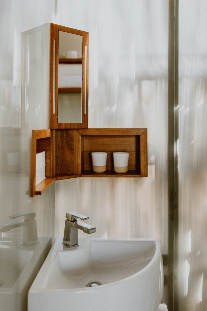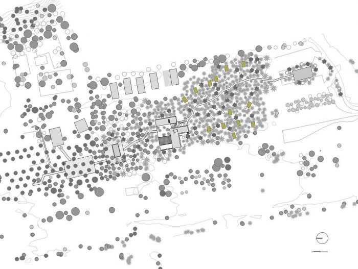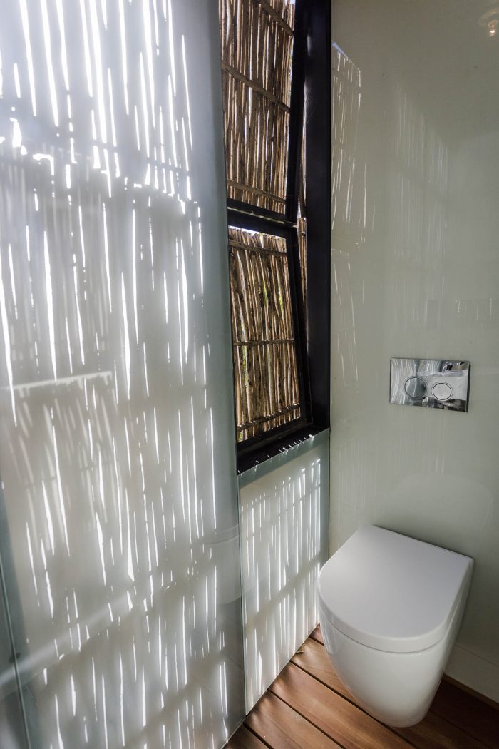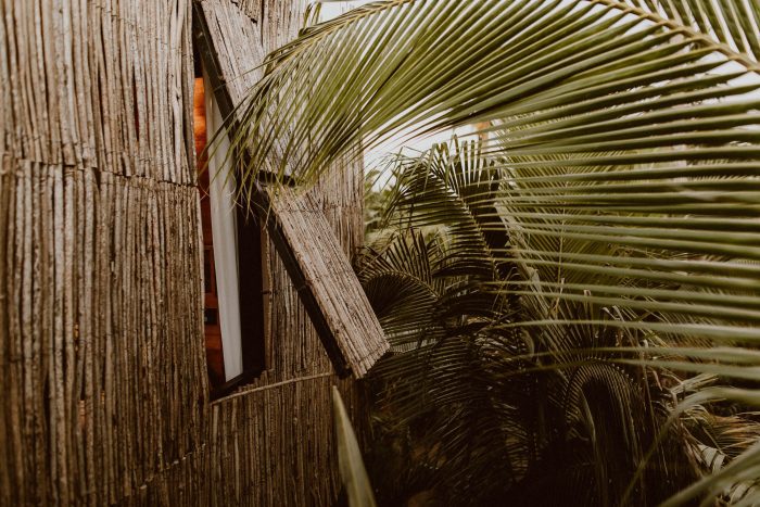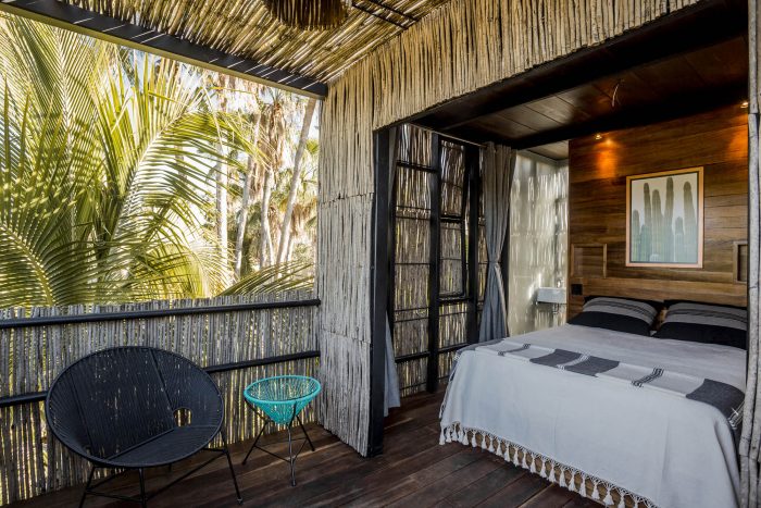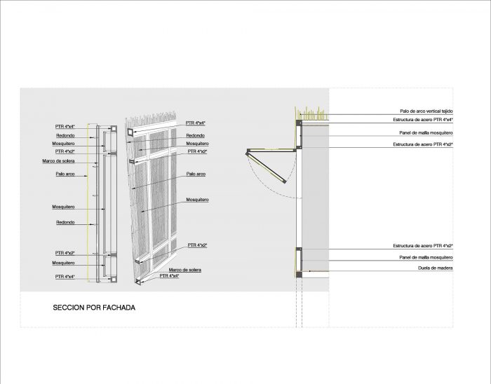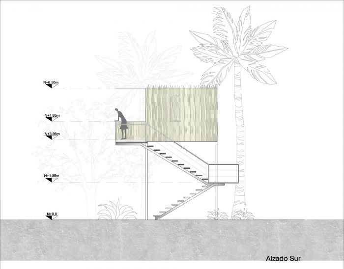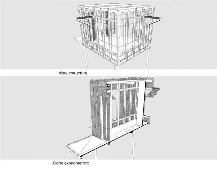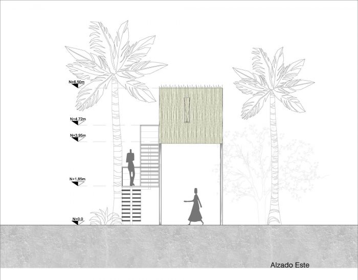 Other materials such as polycarbonate and polished cement are used to form spaces of different natures such as the bathrooms, the closets and the showers, creating a transient and aesthetic contrast with the arch poles, a traditional material common to the region. The used materials evoke the local construction tradition and dignify its use today in a harmonious composition between traditional and modern techniques while maintaining the same concept throughout the entire project. The climatic comfort of the spaces is achieved by locating them at a higher level where cross ventilation passes between the palm grove and the units. Their elevation and openness make it possible to keep the large doors open to the landscape. The metal structure allows a less aggressive intervention in the natural environment (minimum footings) while allowing the necessary safety in an area of easy flooding and risk of hurricane occurrence in the bioregion.