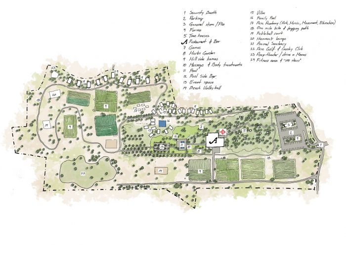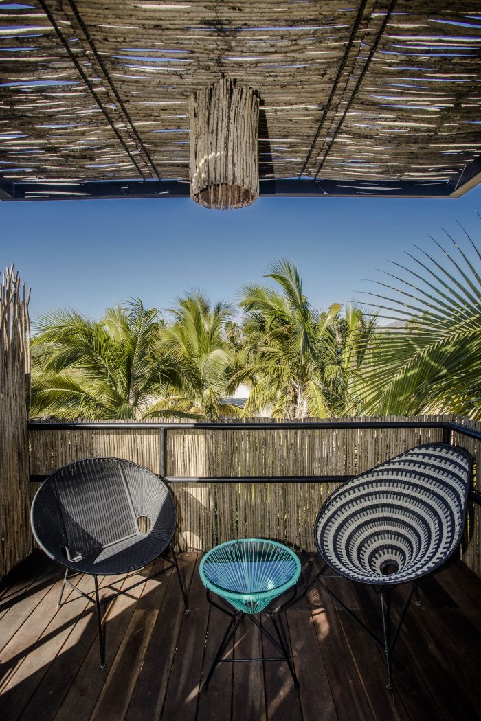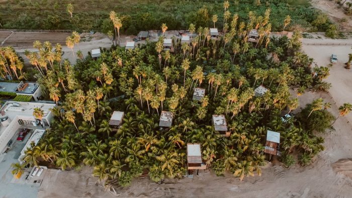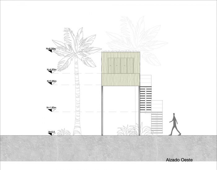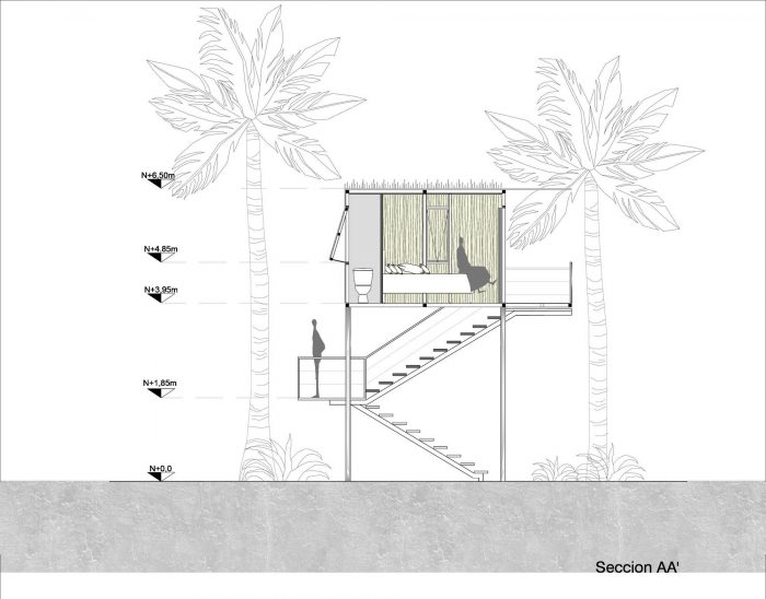 The project is materialized in thirteen individual compact units, each formed by a lightweight steel structure that rises 4-5m from the ground level on elegant metal columns. This system simultaneously allows security (it is an area that can be flooded) and user privacy, creating a surprise effect when crossing the gardens to the restaurant, surrounded by plants and palm trees that hide these suspended volumes. Each unit is formed by a compact box in a complex set of layers formed by the base structure, the mosquito net panels and the "arch pole" fabric (local cane) creating comfort conditions in a minimum space. Each of the spaces is equipped with a private bathroom, a closet and a deck with outdoor showers where visitors can enjoy the privileged views of the Estero (West) and the Sea of Cortez (South) over the dense foliage of palm trees.