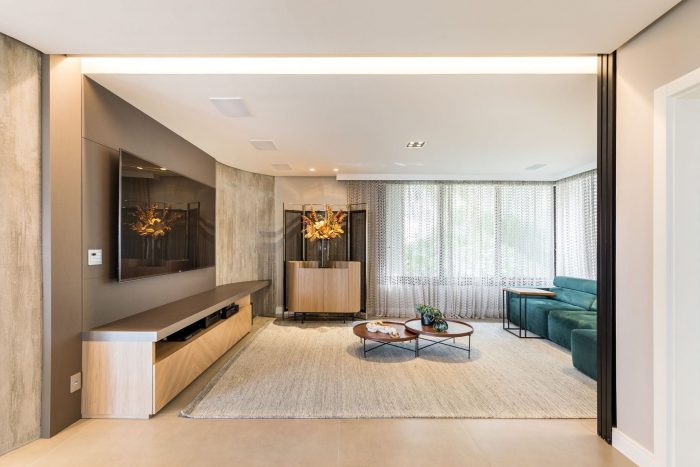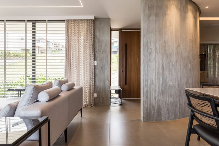 In the main access, the curved wall in exposed concrete, stands out for its form and functionality and aims to induce the visitor to the social area. The element also has the function of bringing privacy to intimate living and the kitchen.