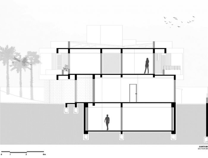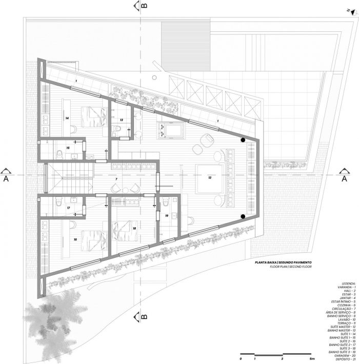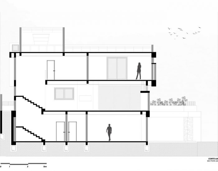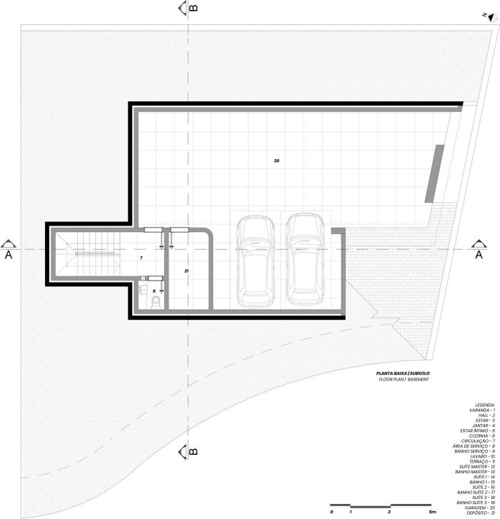 From the angles, visuals and thermal conditions, the 511.91m² were distributed in 03 floors: basement, ground floor and second floor, defined based on their uses. The large volume with a trapezoidal shape, on the second floor, intended for the intimate area, and the ground floor, with generous openings that integrate the external area, stands out. The basement serves the garage and storage of the residence.