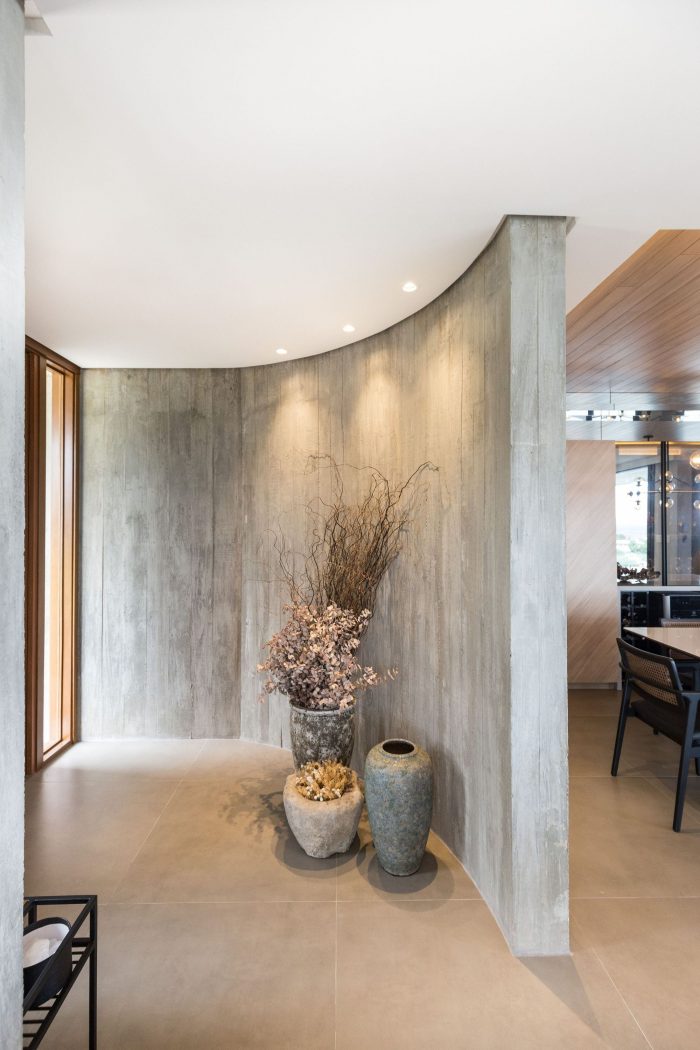 在主通道上,裸露的混凝土弧形墙因其形式和功能而脱颖而出,目的是诱导游客进入社交区。该元素还具有为亲密的生活和厨房带来隐私的功能。