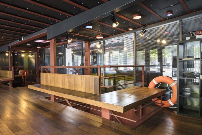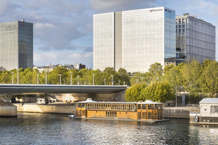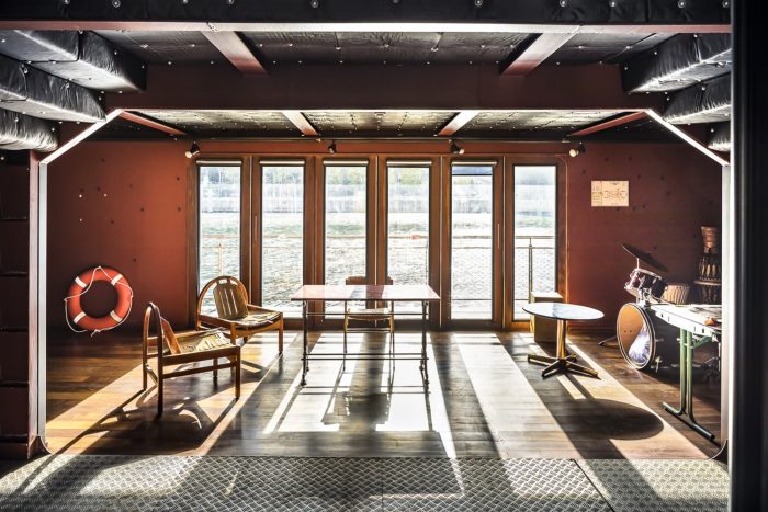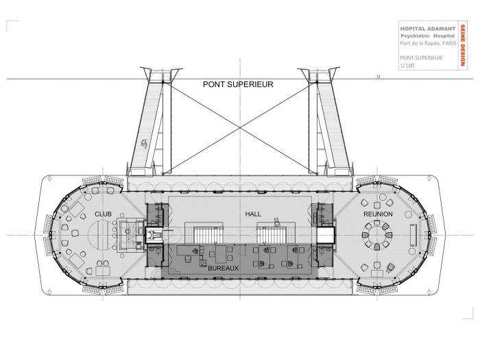 The opening of the building and the façades. On the river, the Adamant maintains a privileged relationship with his environment. The exterior access bridges from the pier to the balcony sides combined with the transparency of the rotundas express the hospital's strong openness. The work on the façades consisted of a uniform wood aspect, all modular, with mobile shutters among the panels. Interior and exterior ambiances can vary depending on the time of the day, controlling the light of the spaces. The inclination of the wooden slats allows also water reflections to enter the interior spaces.