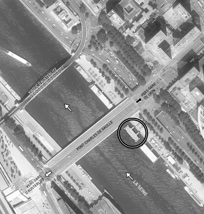 Meteorological building. The approach was to design a building that gives meaning to the most common everyday events by making them spectacular. Weather conditions like rain, sun, or wind become festivals in which the downpour enters the heart of the building, the reflections of light on the river are transformed into plays of shadows and lights behind the movable shutters and the passage of boats engenders a soothing rocking.