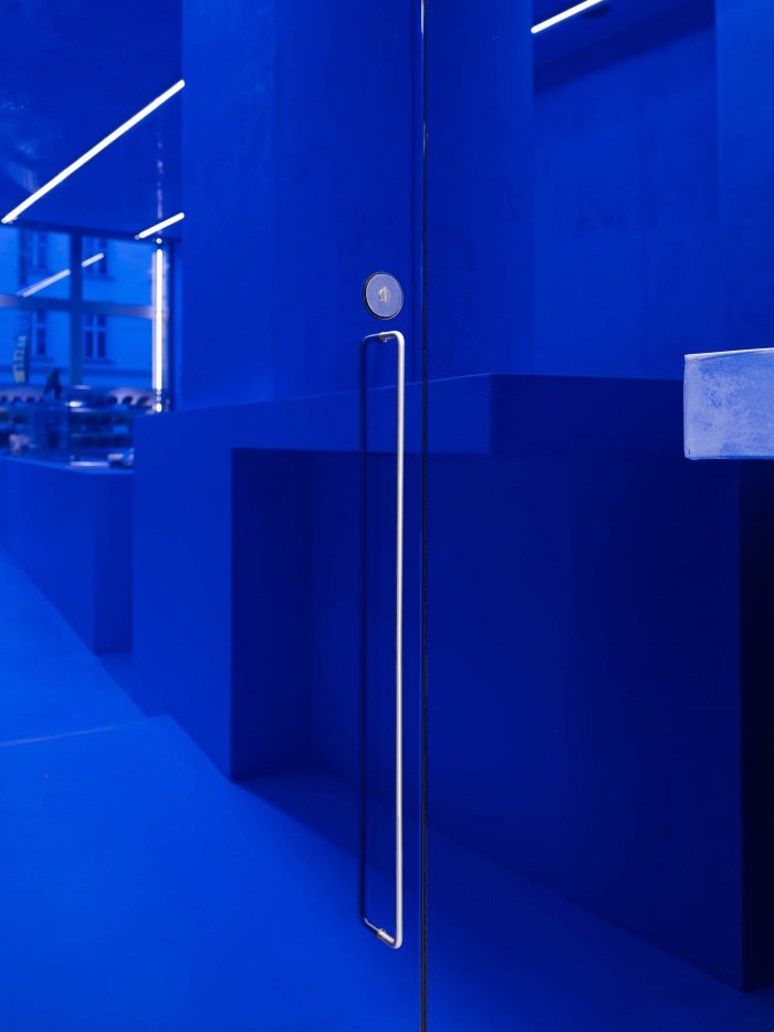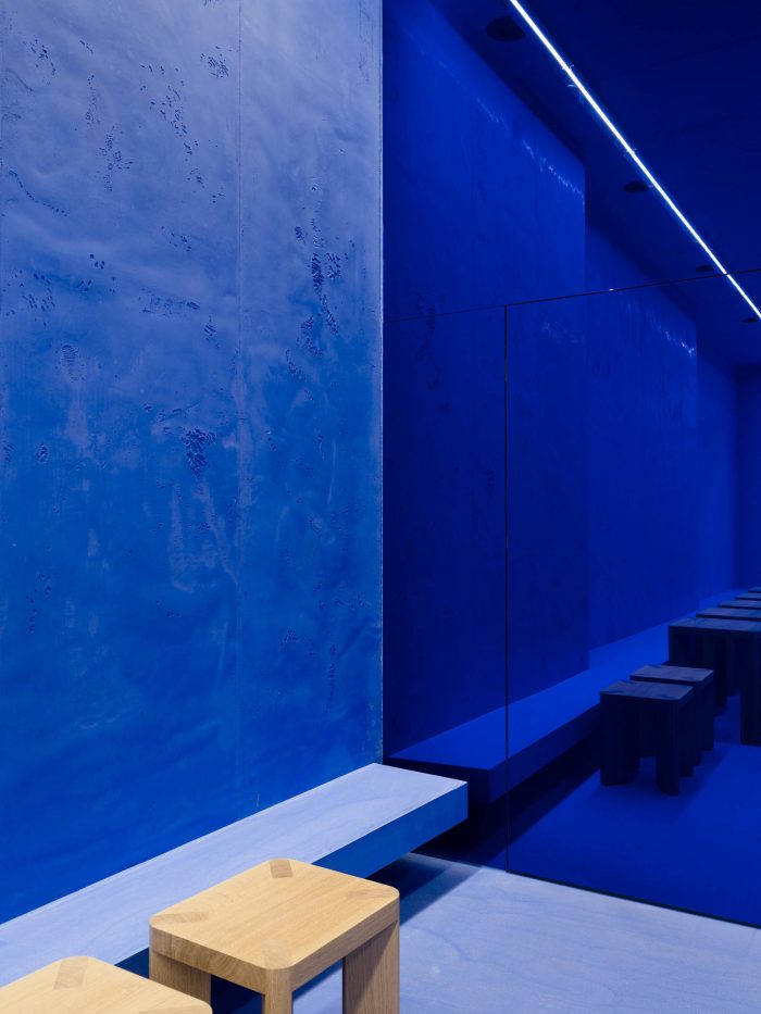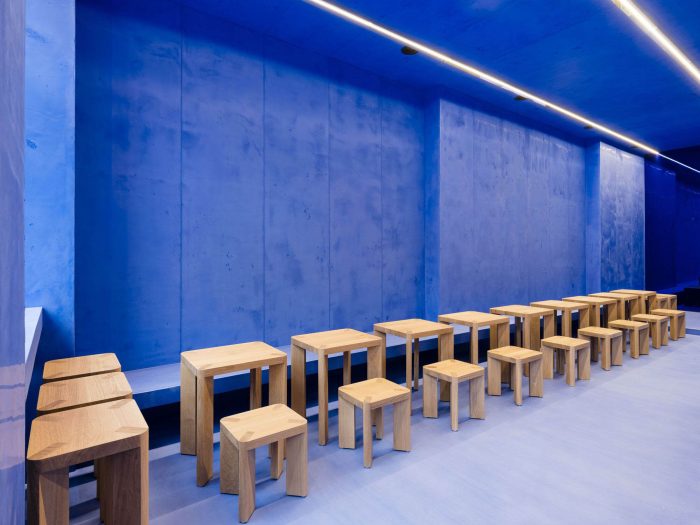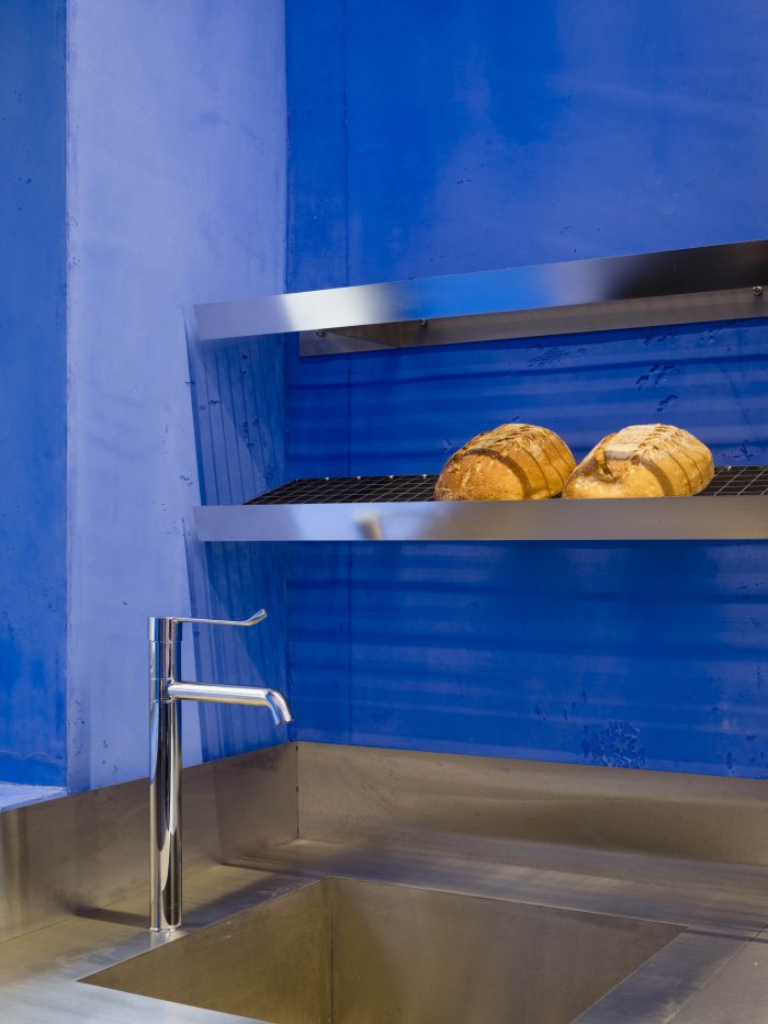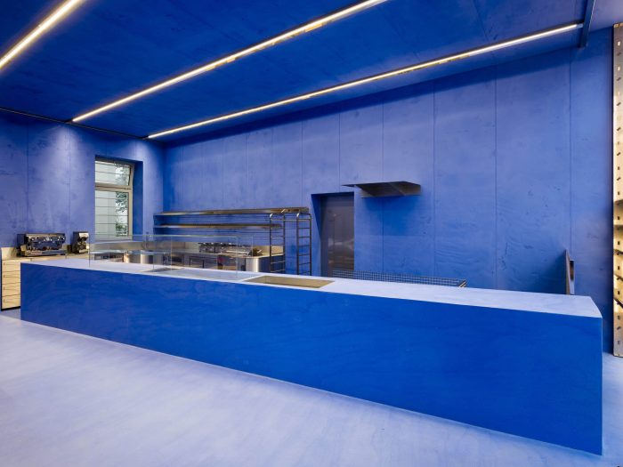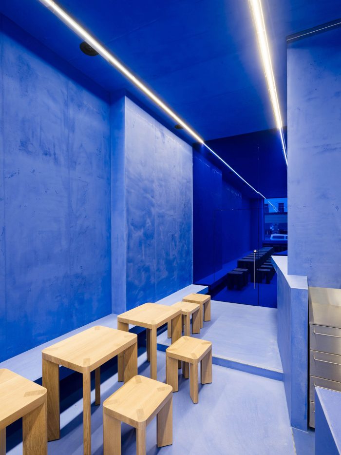 Monotone concrete was applied evenly in 80cm strips in an intense Lapis Lazuli blue colour embedded so consistently throughout the space that the room as a whole becomes a spatial sculpture, inseparable from its bold colour. The furniture designed by Gonzalez Haase AAS for the space is of solid oak while the shelving for baked goods is made of electropolished stainless steel. The incoming natural light alters the intensity of the blue and the surfaces from glossy to matt depending on the time of day, the weather and the position of the observer. Sometimes more light than dark and others rather brilliant and intense.