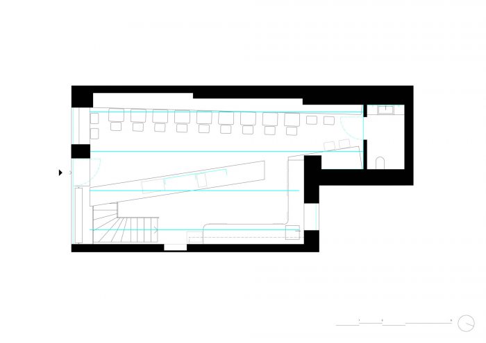 Freeing the 70m2 space from the layers of the past revealed a ceiling of 3.8m in height and allowed the length of the space to be viewed in its entirety from the front of the 13m long wall. No inlaid walls or edges were used. A diagonal counter, which runs from the entrance to the end of the shop, divides the space into two functional areas and guides the visitor along the length of the store from entering to placing and then receiving their order. Uniform in texture and colour, this long concrete counter visually merges with both floor and wall surfaces, becoming an organic part of the room due to its proportions and size.