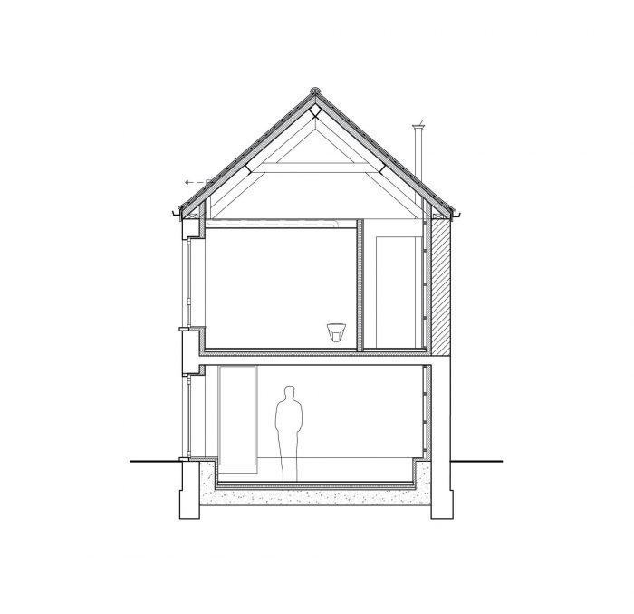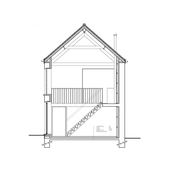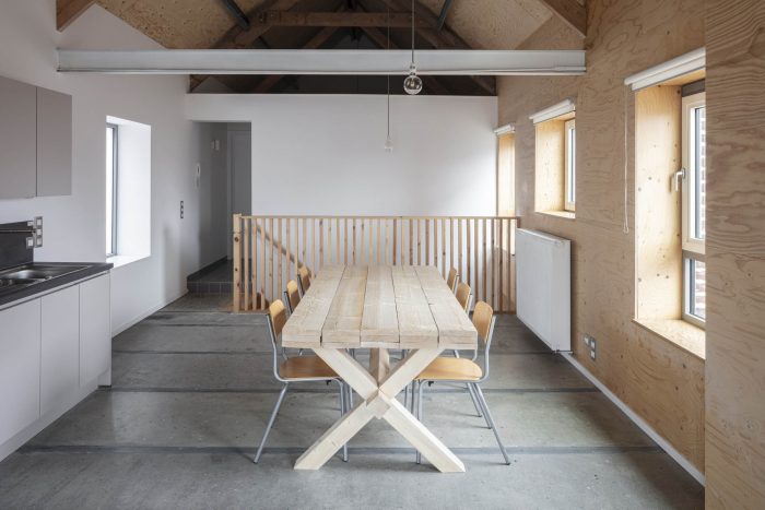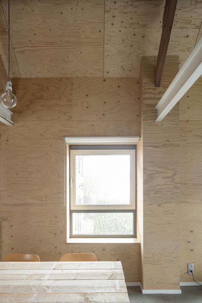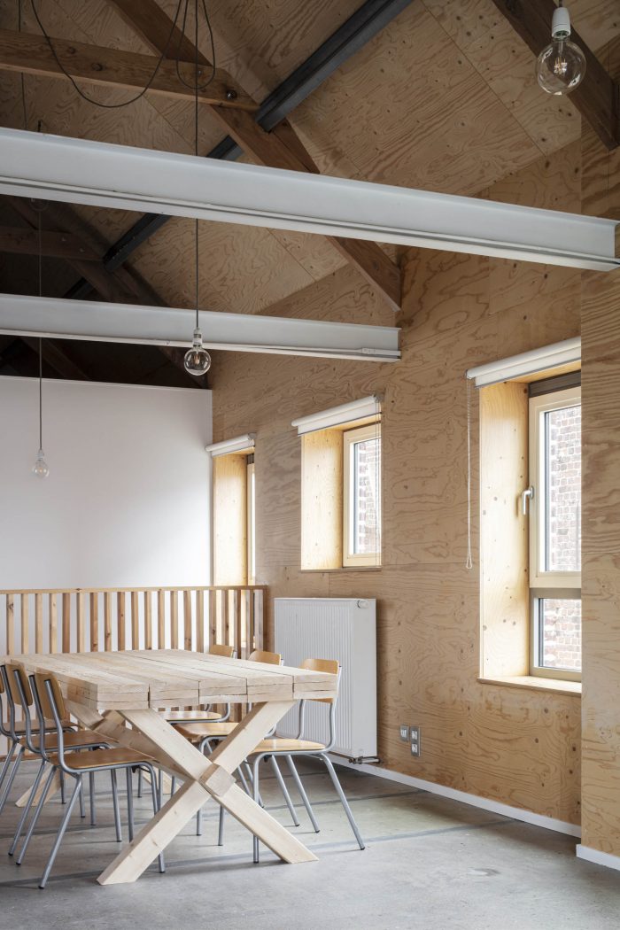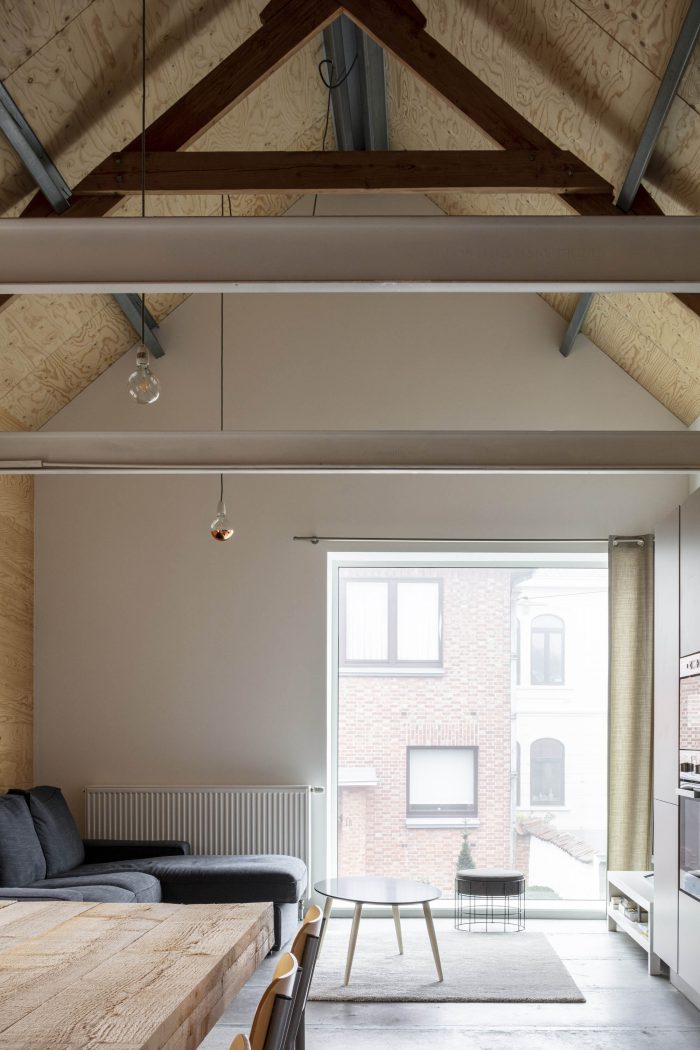 We kept the existing wooden roof structure with steel purlins visible. They are supporting a new industrial sarking roof. We isolated also all the walls and floors. The existing windowopenings get new windows.