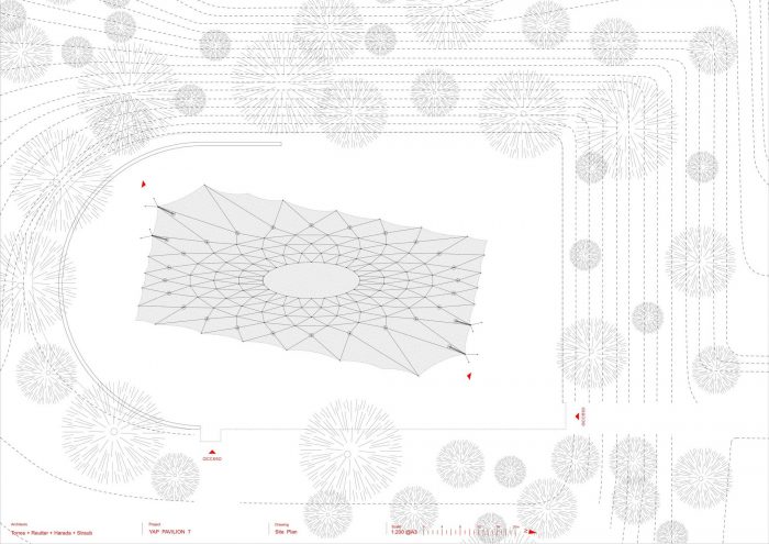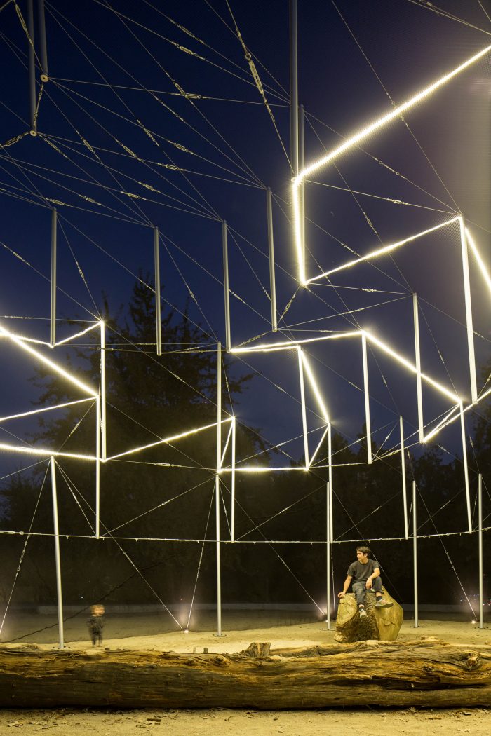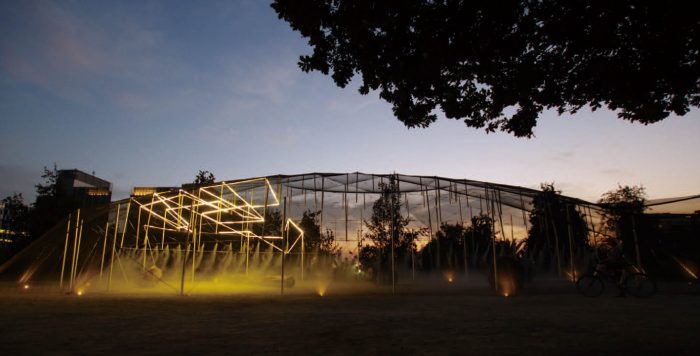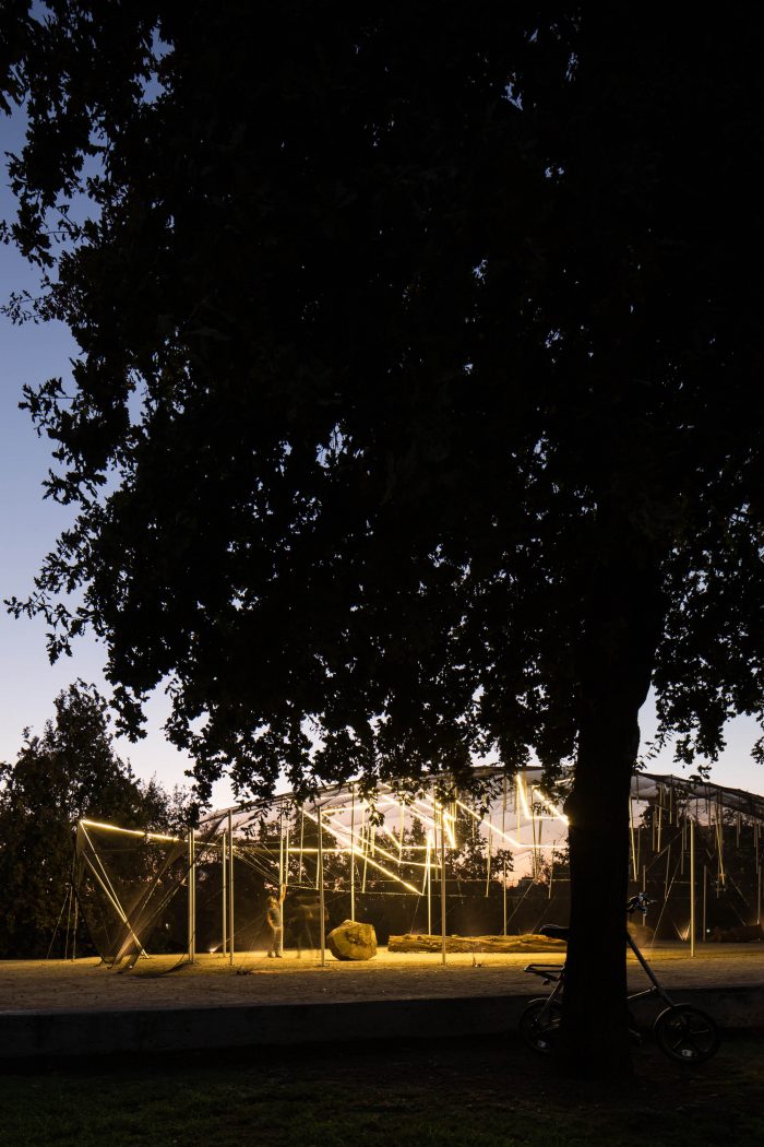 Late in the afternoon against the light, one can see the frame against the sky. It is the moment of glory, an event is approaching and the pavilion dresses up for the party. Darkness invades as a line of light runs through some tensioners that hold the tubes, they float in the dark and celebrate the start of a new event. In turn, the interior is clearly drawn thanks to the mesh that bathes in light. Simultaneously, one can see the park's skyline between the illuminated frame. The event ends, and the structure becomes imperceptible.