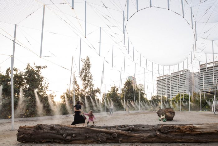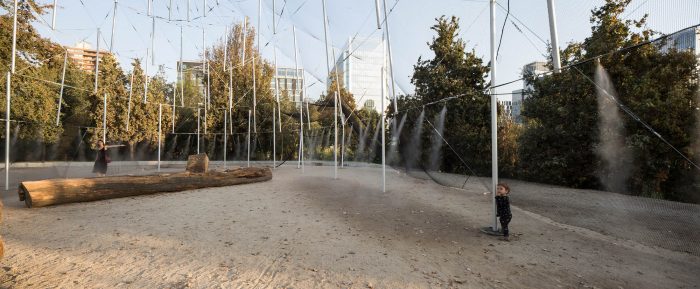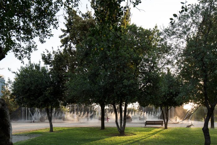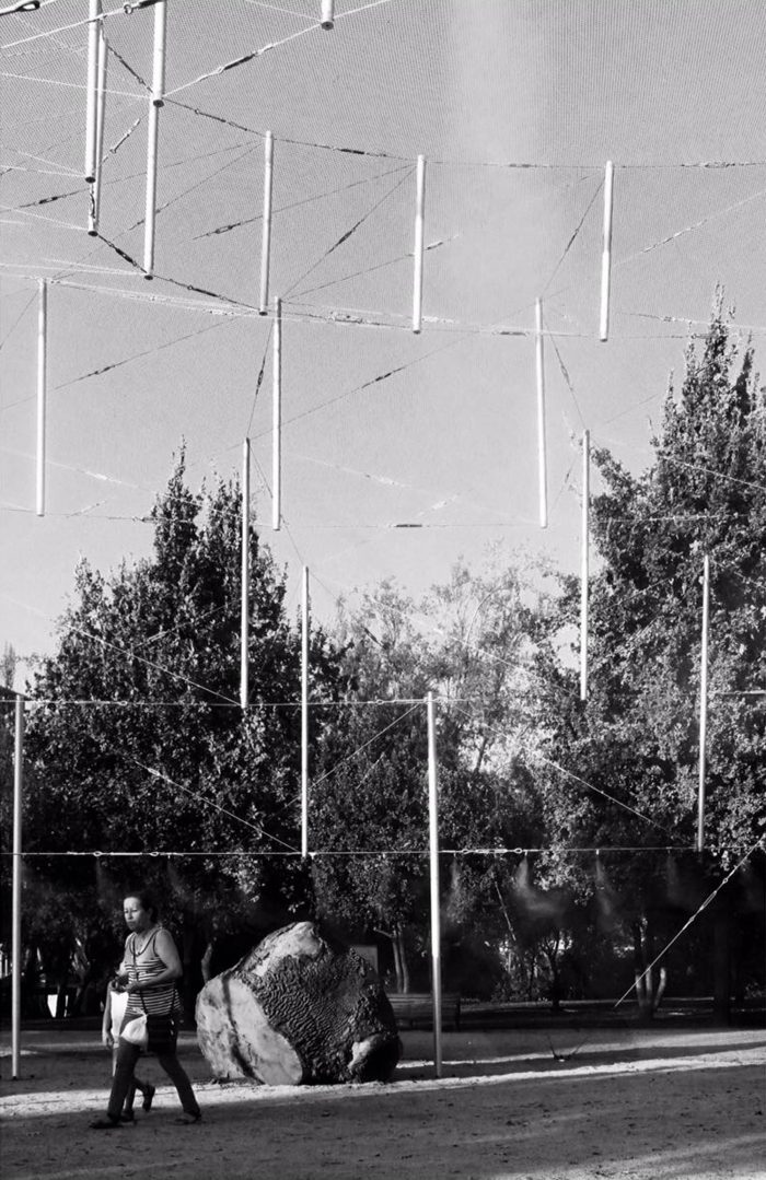 On this occasion, it is made up of a translucent mesh that covers its body and disappears in the frontal view, while when foreshortened it acquires a more dense appearance; accentuating the ambiguity between the interior and exterior space. It is refreshed by the light shade of the lattice, the wind and the water in the form of a cool breeze. A series of water vaporizers at the height of the body is activated intermittently, tempering the place during the day as a shelter from the strong summer heat.
