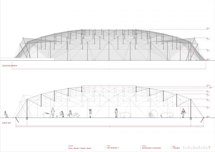 The domed structure is configured by a suspended void of slender elements that float in the air. It has an ellipse-shaped floorplan inscribed in a rectangle. It is a dematerialized vault 36 meters long, 16 meters wide with a total height of 6 meters. The centre of the enclosure is freed and the supports are located in the perimeter. The passerby looks up and in surprise; trying to figure out how a system like this works, in which nothing touches and everything floats.