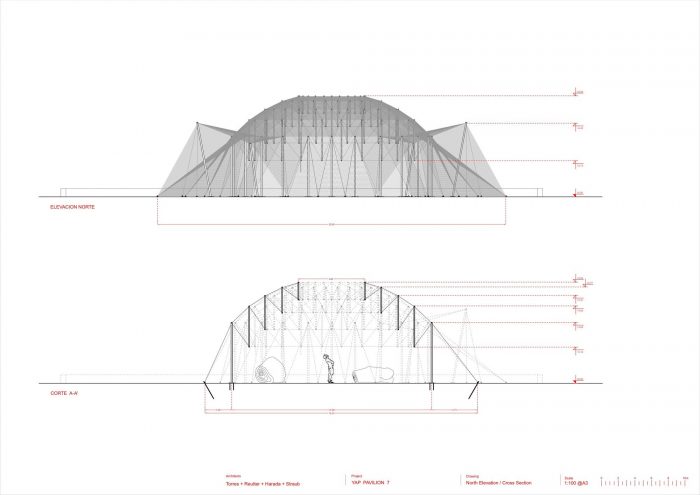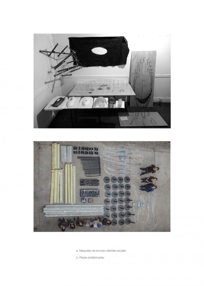 The research was conducted based on empirical tests with prototypes of different scales. Scale models of 1:50, 1:25, 1:10, 1: 5, 1: 2 and finally 1: 1-, in multiple materials that allowed testing different themes that deepened the investigation: (a) the structural capacity and the sequence assembly, (b) spatiality, (c) the number of elements that made up the pavilion, their dimensions, materiality, etc., (d) the quality of the mesh or surface that encloses the void with respect to its colour, opacity, elasticity and appearance, and finally (e) the content of the vault, its furniture or exhibitions.