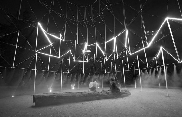 下午晚些时候,在光线的映衬下,人们可以看到框架对着天空。这是荣耀的时刻,一个活动即将来临,亭子为聚会打扮起来。黑暗侵袭,当一条光线穿过一些固定管子的张力器时,它们漂浮在黑暗中,庆祝一个新事件的开始。反过来,由于沐浴在光线中的网眼,内部被清楚地画了出来。同时,人们可以在照明的框架之间看到公园的天际线。活动结束后,这个结构变得难以察觉。