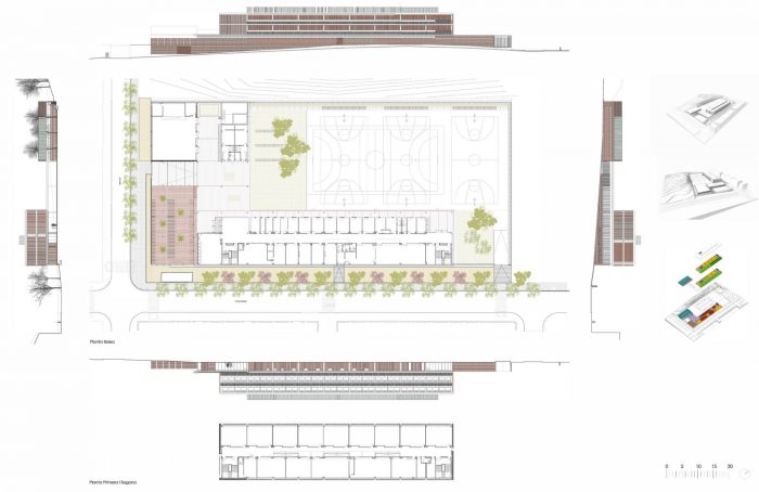 高效,其紧凑的结构有助于最大限度地减少能源损失。最佳循环和干式结构是被动系统,有助于减少建筑的碳足迹。减少生态足迹:使用无污染、耐用、易回收的材料;在项目和施工过程中使用可再生能源、控制系统、废物管理和使用BIM技术。教室被安排在与巴勃罗-伊格莱西亚斯街道对齐的体量中,在不产生剩余空间的情况下,正式确定了中心的一个限制。体育馆面向Icaria街道,伴随着入口,有一个带有树木的空间,将作为自行车停车场。