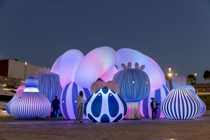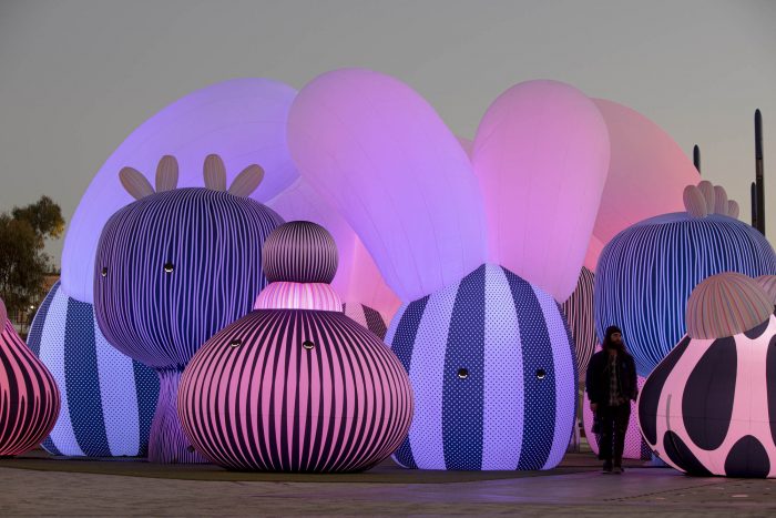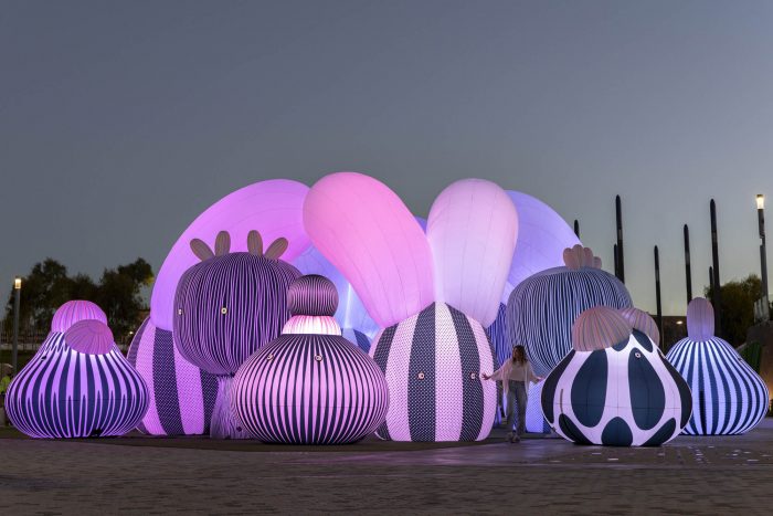 The Airship Orchestra by Melbourne art and technology company ENESS is reinvigorating cities across the world with a spectacular immersive art experience. The temporary artwork is a mystical tribe of 16 otherworldly inflatable sculptures (some up to six metres) all supported by a fully networked internal system of motion sensors enabling its characters to respond to passers-by; behave as a choir and ‘compose’ a fresh, generative score each night.