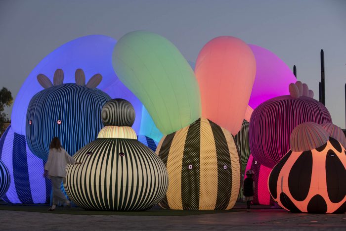 ‘Beamed from the night stars, skin streaked with galaxy and voices like stardust’, the artwork includes a generative soundscape synced with light that spans over a 500 square metre area – an adventure that is aesthetically dynamic both day and night. The Airship Orchestra’s sound experience is its own spatial environment, immersing visitors in an arresting score written character-by-character for a full choir.