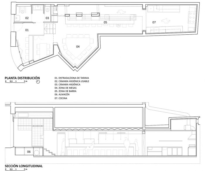 To seat down 2 bars, the first one panoramic in descending diagonal towards the other one, connecting visually what the preexistence separated; and 2 tables, one protected (almost hidden) and the other shared, with 13 legs just in case.