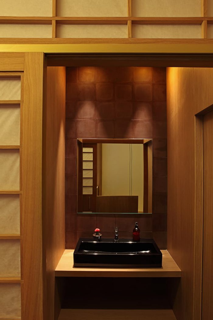 The materials? Oak, the Shōji, carpet at the expense of tatami, the ceramic and the lighting, of shines more than lights... insinuations dancing so quite all over the space, at different highs, with golden reflections and a dark blue body, almost black.
