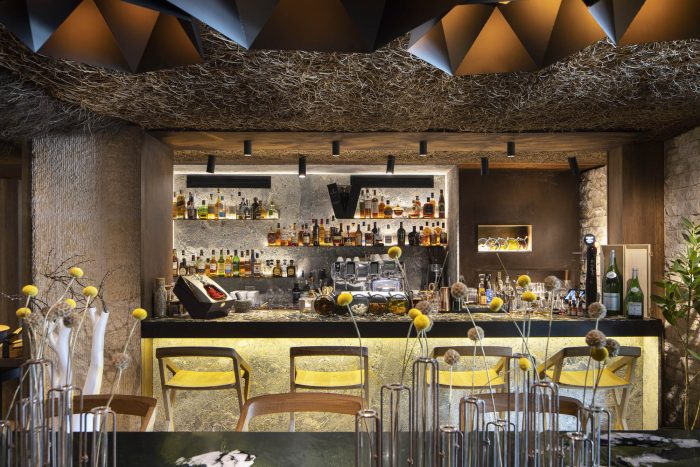 Once the reception is passed, we have a bar area with a capacity for 5 people. In front of the bar, we generate a complementary area. A high table with a capacity for 10 people, which works as a hybrid between the midpoint of the bar and diner area.