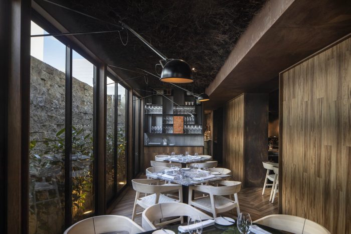 The entrance is framed by a portico of generous height, which gives it hierarchy, strength and defines the main door 3.00 meters high at the entrance of the restaurant. Lined in aged steel tola, looking for the final effect that nature exerts on material as resistant as steel. Once inside the restaurant, a reception space is generated, which has in the background a cooking space with an ancient Japanese technique that consists of cooking on hot charcoal embers.