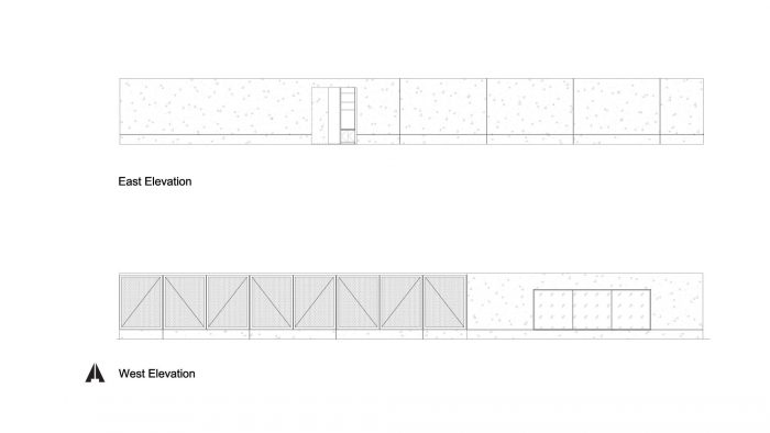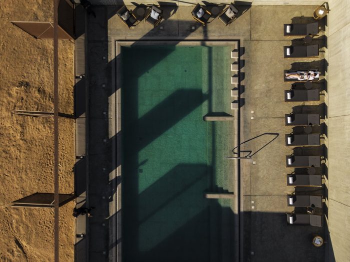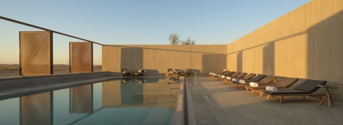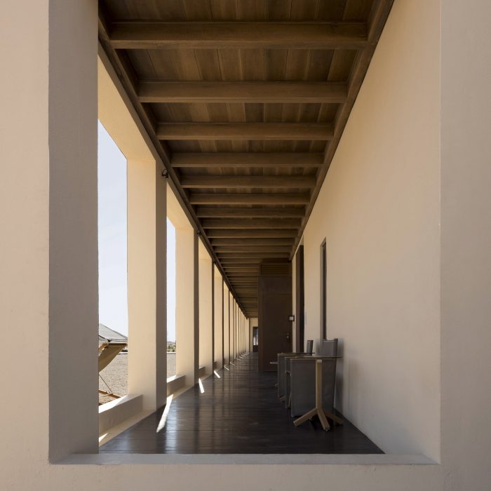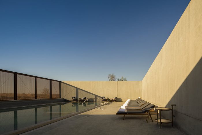The Lodge, Spa and Restaurant buildings are divided by a through-road which creates an unusual and dynamic urbanity to the master plan of the retreat. The buildings together with the historical petroleum pump command a presence to the road in the scarce desert landscape and will become both a destination and stop-off for those who know and for those who then discover this new intervention.