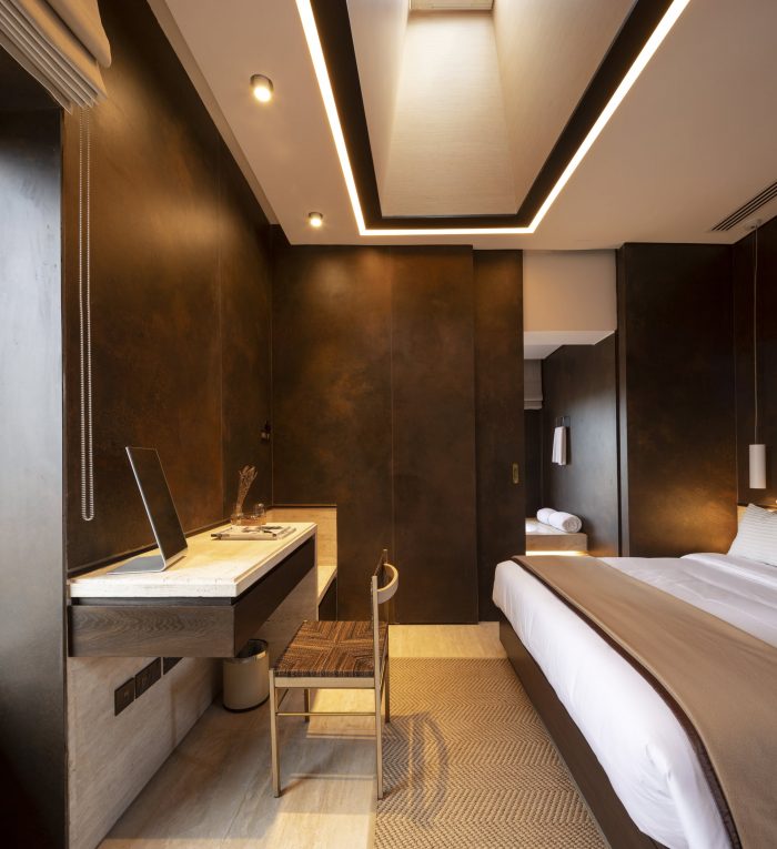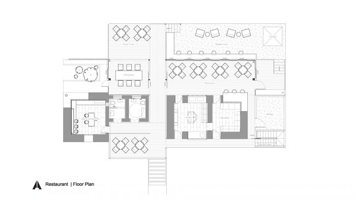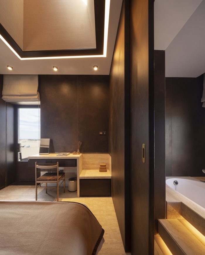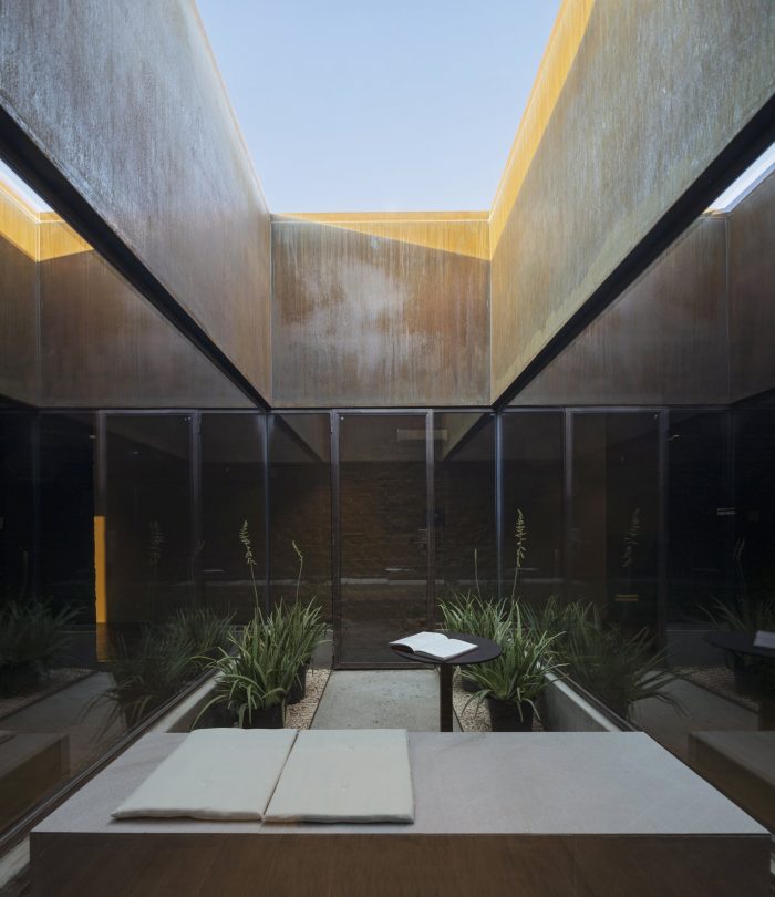 The restaurant and visitors’ reception are located on the other side of the property and comprise a dining room, outdoor terrace, fire-pit and a public roof terrace.