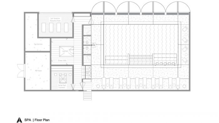 山庄由餐厅、接待室、图书馆和屋顶露台组成。在五间卧室的小屋中,每个房间都有一个用于观星的特色天窗,豪华的房间还有一个私人屋顶露台和双视角的体验。专门建造的温泉建筑内有一个露天盐水游泳池和三种盐浴体验:热、水和盐吸入。