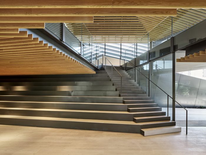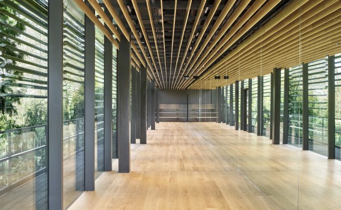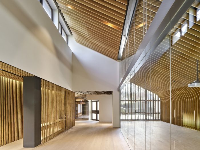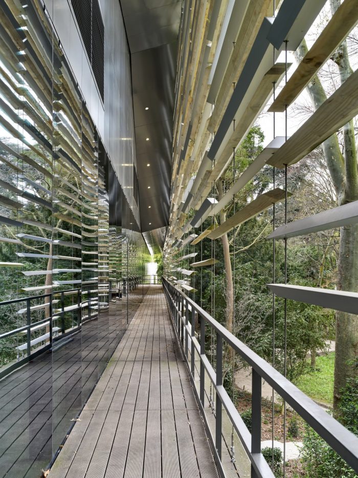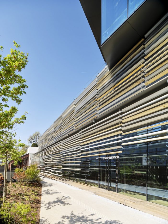 The display space was designed in an extended linear sequence from the paths through this garden. A screen made from aluminum and wood is inserted between the path and exterior environment while it continues to meander horizontally and vertically, controlling the relationship between the two. The dream of Albert Kahn of blending the garden and display space was achieved by blending the environment and architecture.